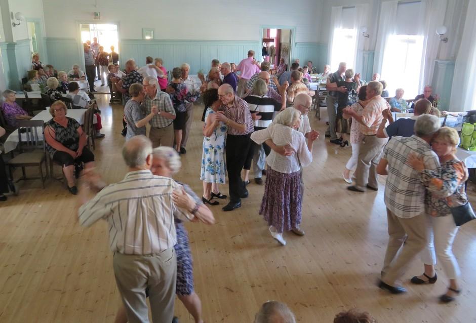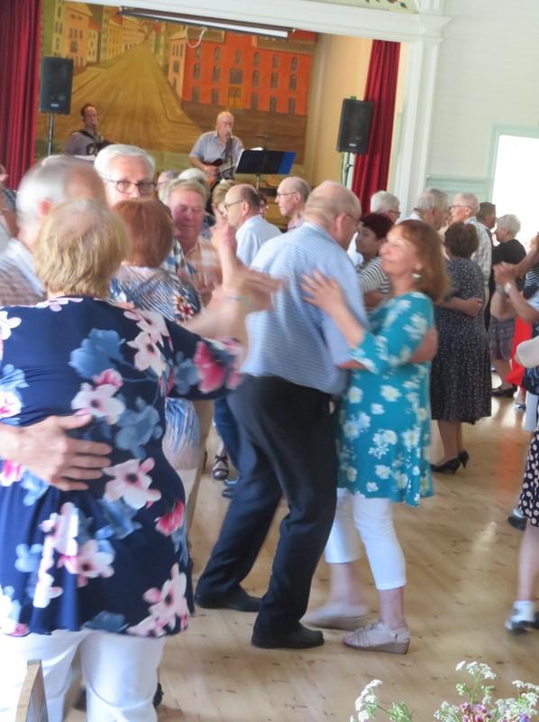 Juhlapaikalla olivat jo tanssitkin alkaneet. Innokkaimmat jaksoivat valssata sisätiloissa, joissa kyllä tarkeni. Suurin osa väestä istuskeli pihateltan varjossa.